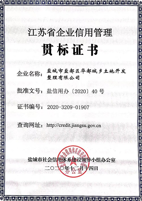 根據(jù)《“十三五”期間深入推進全省企業(yè)信用管理貫標和示范創(chuàng)建工作實施意見的通知》(蘇信用辦〔2016〕39號)和《關于組織開展2020年度企業(yè)信用管理貫標和示范創(chuàng)建工作的通知》(鹽發(fā)改信用〔2020〕49號)要求,經企業(yè)申請、各縣(市、區(qū))推薦和第三方信用服務機構實地評價等程序,我集團子公司鹽城市鹽都區(qū)華都城鄉(xiāng)土地開發(fā)整理有限公司符合2020年度省信用管理貫標企業(yè)認定標準,榮獲江蘇省企業(yè)信用管理貫標證書。