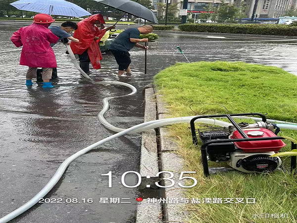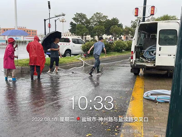 上午10點,經(jīng)路面作業(yè)現(xiàn)場工作人員報告,在神州路與鹽瀆路交界處,最深積水達(dá)到15CM以上。應(yīng)急小分隊接到指令后,迅速駕駛車輛,運載水泵、水管、鐵鍬等防汛物資,不到10分鐘就迅速趕到現(xiàn)場。在公司負(fù)責(zé)人劉鳳權(quán)、孫榮才等人的現(xiàn)場指揮下,搶險人員立即查找造成堵塞積水的原因。經(jīng)過查找發(fā)現(xiàn),原來積水處只有一個下水道,無法快速排水。劉鳳權(quán)當(dāng)機(jī)立斷,指揮搶險人員立即撬開附近窨井蓋,把水管放進(jìn)窨井,發(fā)動水泵,往不遠(yuǎn)處的雨水井排水。這時雨越下越大,風(fēng)越刮越猛,搶險隊員們冒著狂風(fēng)暴雨,不畏雷鳴電閃,齊心協(xié)力清理積水,有的發(fā)動水泵梳理管道;有的用大掃帚清掃路面積水;有的清理積水中的垃圾雜物……隊員各司其職,分工合作,在時間緊迫、環(huán)境惡劣的情況下盡力完成排水作業(yè),經(jīng)過緊急搶排,道路恢復(fù)了通暢。